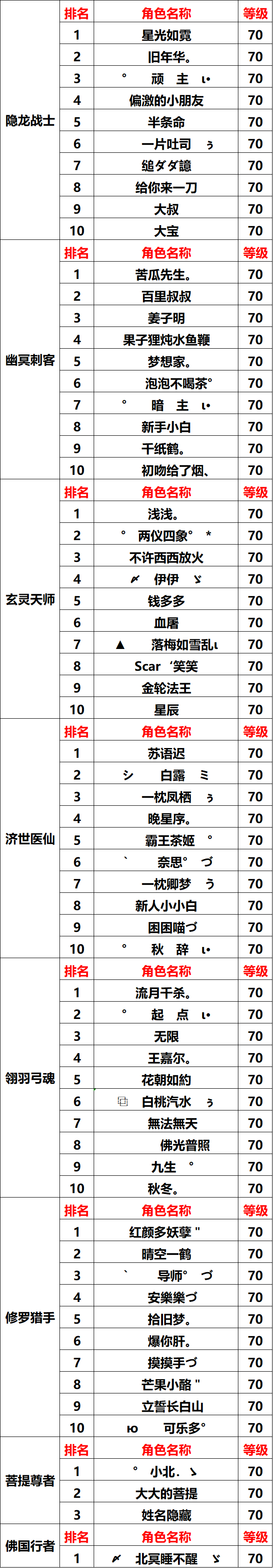 上榜玩家【隐龙战士】、【幽冥刺客】、【玄灵天师】、【济世医仙】、【翎羽弓魂】、【修罗猎手】综合实力需达到7000,【佛国行者】、【菩提尊者】综合实力达到6000,月度职业排名奖励将会按照最终结算时候的排行榜发放奖励,月度排名会清除玩家身上的任何状态