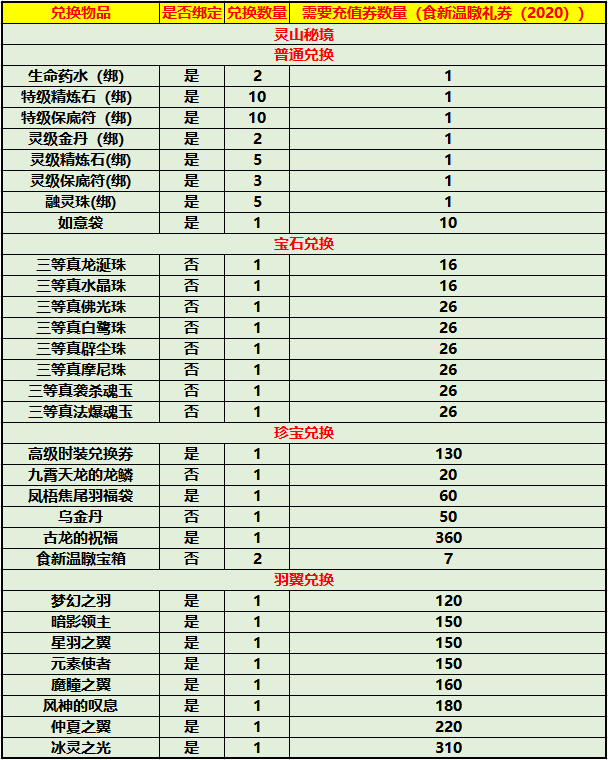 5000元:食新温暾宝箱(2020)*12,六等宝石原石(绑)*1,三等升灵法石*1,上古金晶*1,超级金柳露(绑)*5
