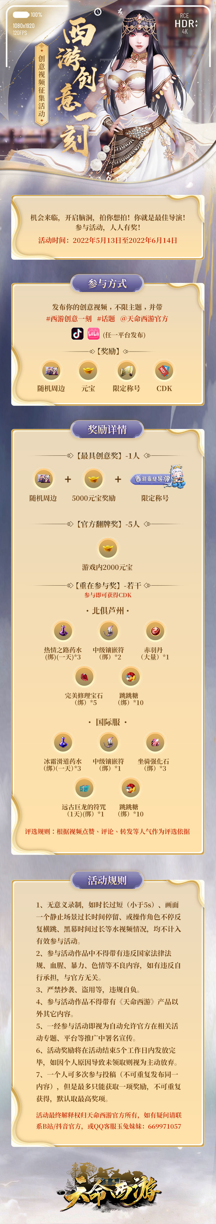 活动期间,发布任意主题的原创视频,带话题#西游创意一刻#并@天命西游官方即可。