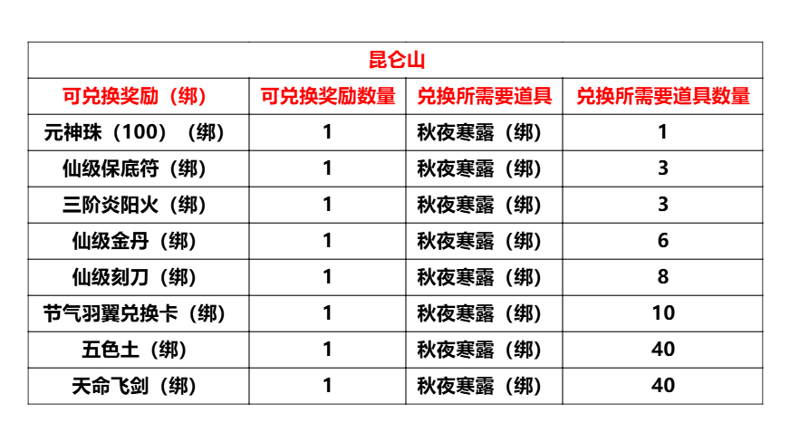 活动内容:上交25个道具【霜叶知秋(绑)】可兑换25个道具【秋夜寒露(绑)】