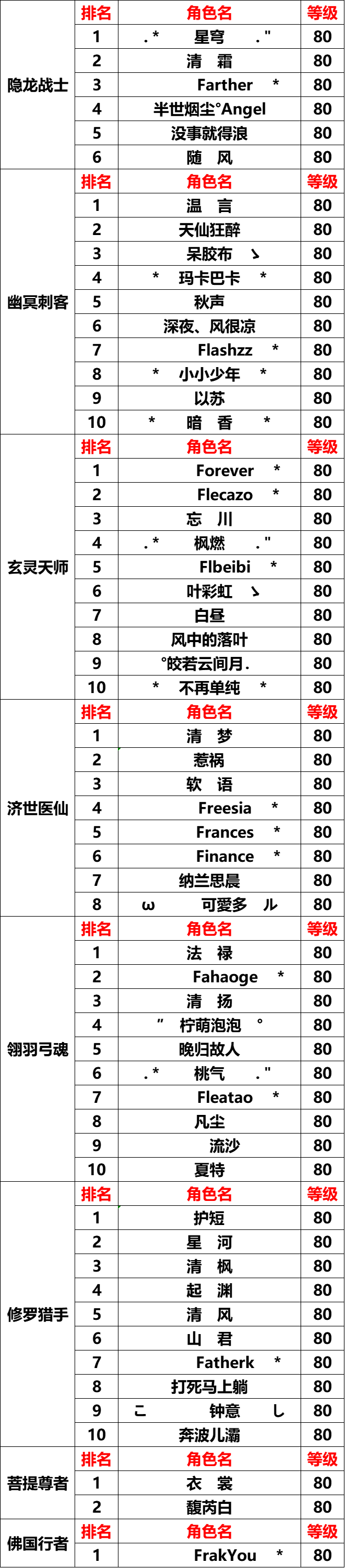 ※上榜前十玩家【隐龙战士】、【幽冥刺客】、【玄灵天师】、【济世医仙】、【翎羽弓魂】、【修罗猎手】综合实力需达到11000,【佛国行者】、【菩提尊者】综合实力达到8000,月度职业排名奖励将会按照最终结算时候的排行榜发放奖励,月度排名会清除玩家身上的任何状态