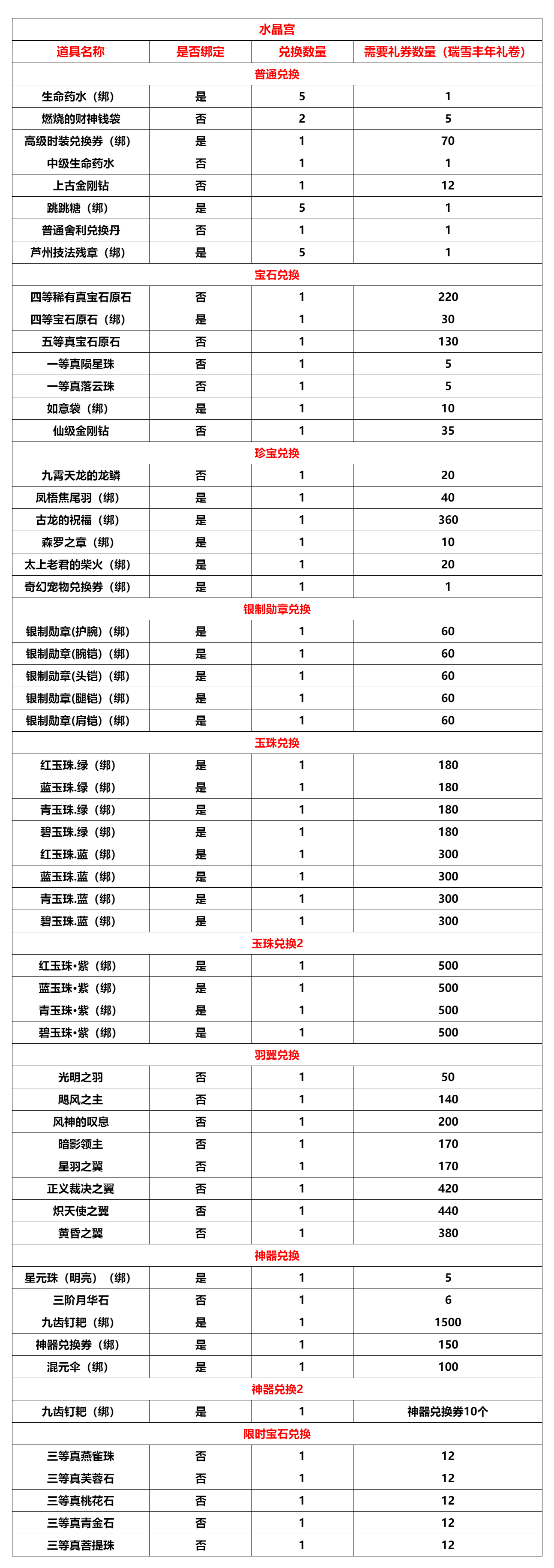 仙级精炼石*1、仙级保底符*1、超级金柳露*1、坐骑保底符*1、中级合成符*1、二等真芙蓉石*1、二等真青金石*1、二等起星灵晶*1、二等升灵法石*1、初级合成符*2、星元珠(黯淡)*1、星元珠(微光)*1、高级装备精炼材料*1、宠物附身符*2、天音海螺*1、无骨舍利碎片(金)*1、二等真陨星珠*1、二等真落云珠*1、瑞雪丰年宝箱*1、新.吸收药水(时效)*1、新衣-时装卷*1、六猪原石箱*1、极品女儿红*1、高级首饰符语兑换劵*1、猪星连珠*1、六等真宝石原石*1、四等宝石原石(绑)*1、四等元魄石(绑)*1、无骨舍利(金)*1、五等宝石原石(绑)*1、六等宝石原石(绑)*1、红尘之翼*1、战神之翼*1、乌金丹*1、仙级金刚钻*1、上古金晶*1、紫鳞烛龙*1、永恒仙金*1