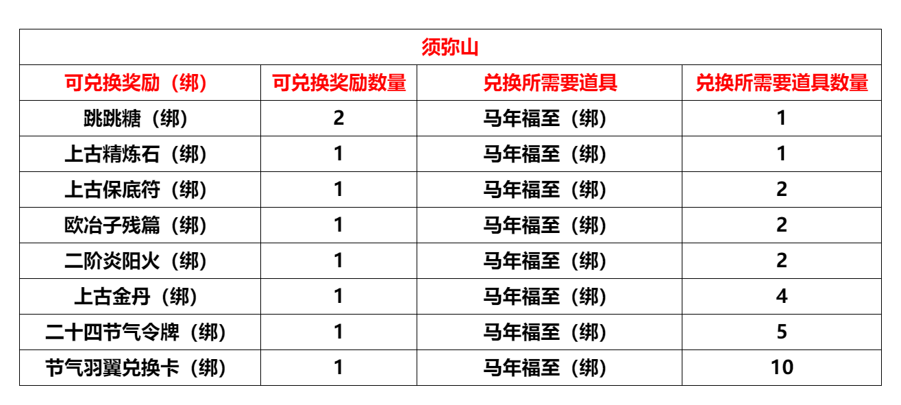 须弥山:元神珠(500)(绑)*1、上古精炼石(绑)*1、上古保底符(绑)*1、赤羽丹(大量)*1、仙灵珠(30000)(绑)*1、跳跳糖(绑)*10、金色焰火时装盒(7天)(绑)*1