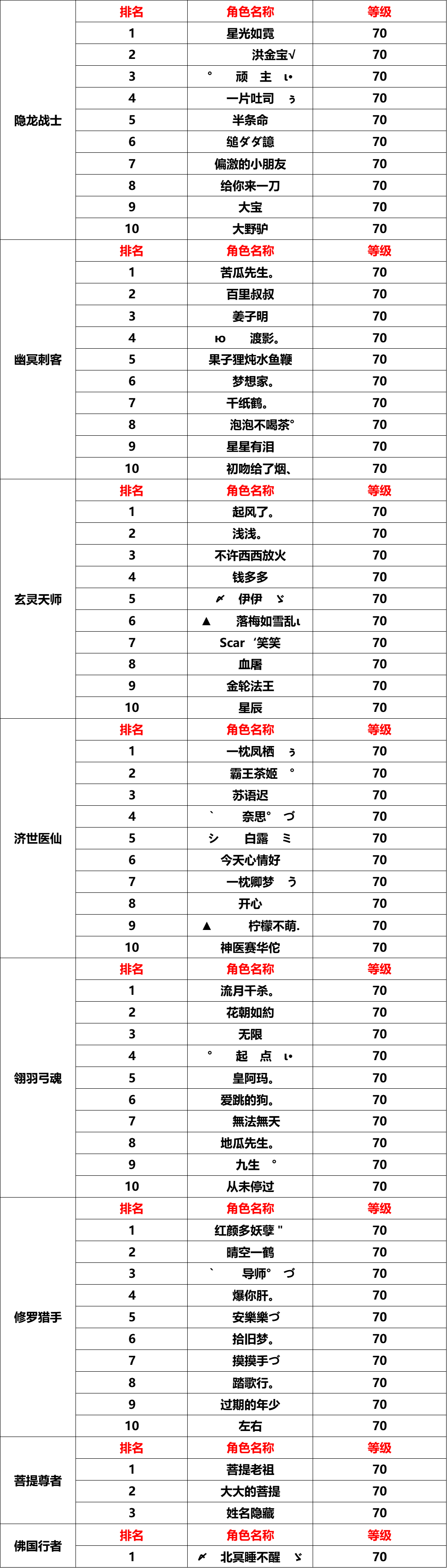 上榜玩家【隐龙战士】、【幽冥刺客】、【玄灵天师】、【济世医仙】、【翎羽弓魂】、【修罗猎手】综合实力需达到7000,【佛国行者】、【菩提尊者】综合实力达到6000
