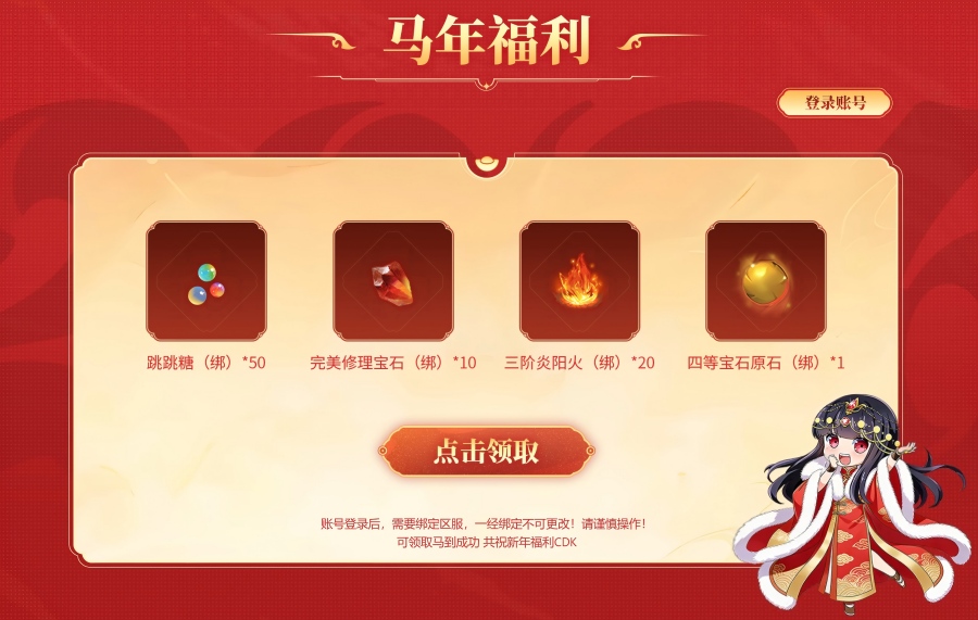 账号登录后,需要绑定区服,一经绑定不可更改!请谨慎操作!