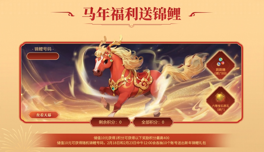 3.将在2026年2月18日和2026年2月23日这两天进行随机抽取号码牌每天10名,共20名玩家发送2026年新年锦鲤礼包CDK!