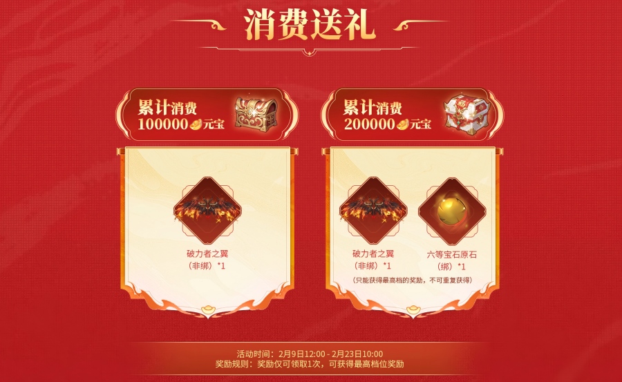 活动期间内消费100000元宝,即可获得羽翼:破力者之翼(非绑)*1