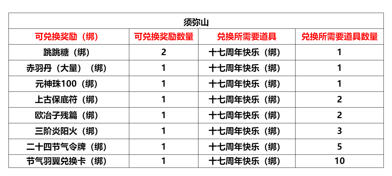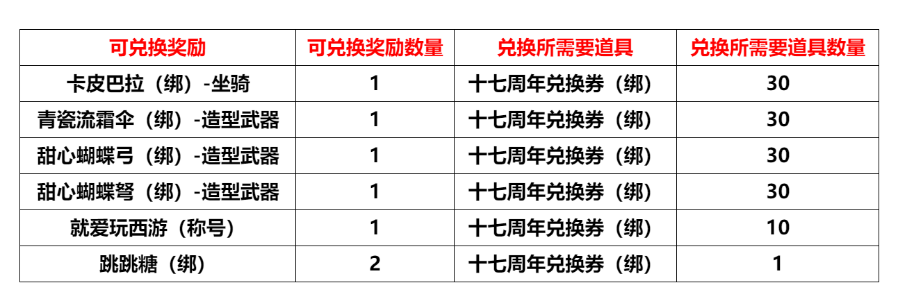 活动内容:上交25个道具【周年纪念章(绑)】可兑换25个道具【十七周年快乐(绑)】