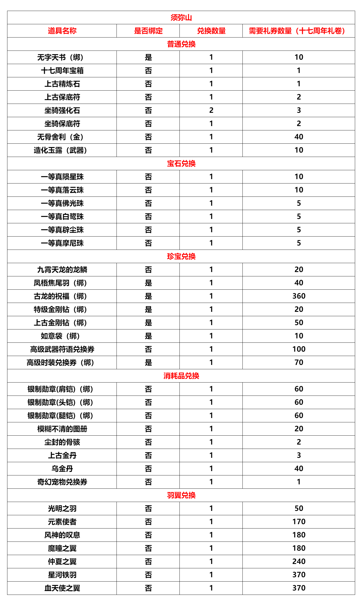 须弥山:上古玉锥(绑)*1、欧冶子残篇(绑)*5、高级装备精炼材料(绑)*1、财神的钱袋(100金)*1中级合成符*1、上古金丹*1、上古精炼石*1、上古保底符*1、高级装备精炼材料*1、赤羽丹(强效)*1、一等起星灵晶*1、一等升灵法石*1、宠物附身符*2、三阶炎阳火*1、超级金柳露*1、二等起星灵晶*1、二等升灵法石*1、一等真袭杀魂玉*1、一等真法爆魂玉*1、无骨舍利碎片(金)*1、一等真陨星珠*1、一等真落云珠*1、一等真佛光珠*1、一等真白鹭珠*1、六等宝石原石双倍袋(绑)*1、六等宝石原石三倍袋(绑)*1、四等宝石原石(绑)*1、五等宝石原石(绑)*1、六等宝石原石(绑)*1、四等真宝石原石*1、五等真宝石原石*1、星辰泥*1、长生果*1、无骨舍利(金)*1、四等稀有宝石兑换券*1、三等升灵法石*1、辉寂永夜*1