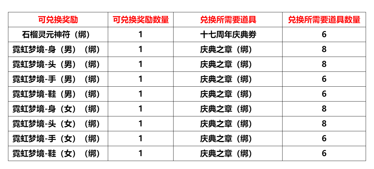 活动内容:上交25个道具【周年纪念章(绑)】可兑换25个道具【十七周年快乐(绑)】
