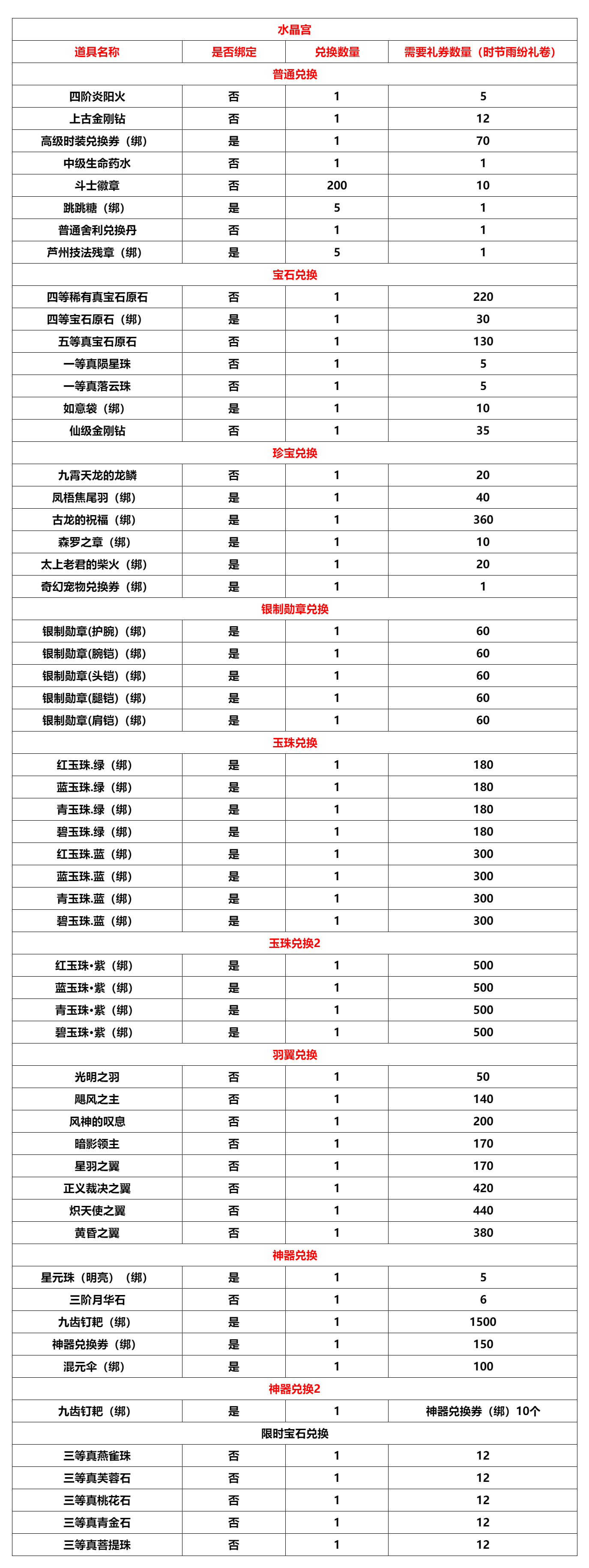 仙级精炼石*1、仙级保底符*1、仙级金丹*1、一等起星灵晶*1、一等升灵法石*1、二等升灵法石*1、二等真芙蓉石*1、二等真青金石*1、三阶炎阳火*1、超级金柳露*1、无骨舍利碎片(金)*1、永恒仙金碎片*1、一等真陨星珠*1、一等真落云珠*1、二等真佛光珠*1、二等真白鹭珠*1、中级合成符*1、永恒仙金*1、无骨舍利(金)*1、上古金晶*1、四等宝石原石(绑)*1、五等宝石原石(绑)*1、六等宝石原石(绑)*1、四等真宝石原石*1、五等真宝石原石*1、六等真宝石原石*1、星辰泥*1、长生果*1、坐骑符语-铜墙铁壁*1、红尘之翼*1、战神之翼*1、千丝缠魂*1、禁足术*1、四等稀有真宝石原石*1、九霄天龙的龙身*1、上古金晶碎片*1、成长果实*1