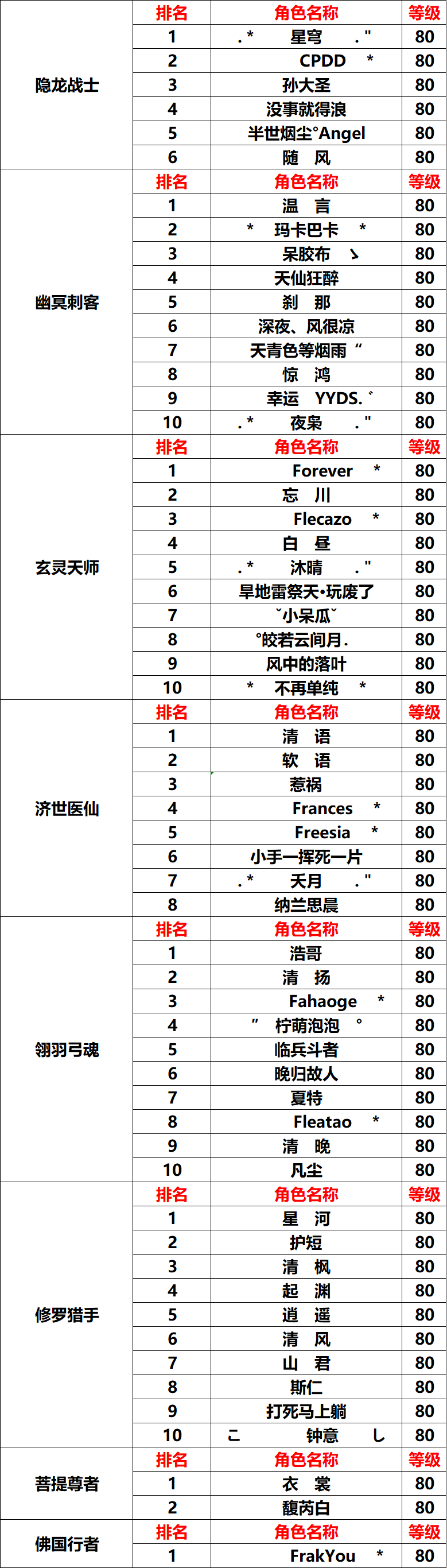 ※上榜前十玩家【隐龙战士】、【幽冥刺客】、【玄灵天师】、【济世医仙】、【翎羽弓魂】、【修罗猎手】综合实力需达到11000,【佛国行者】、【菩提尊者】综合实力达到8000,月度职业排名奖励将会按照最终结算时候的排行榜发放奖励,月度排名会清除玩家身上的任何状态